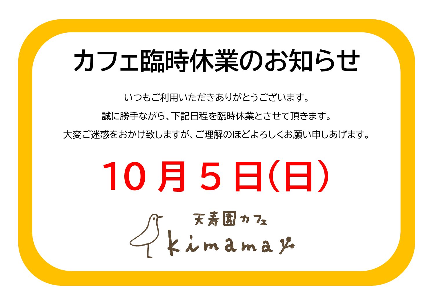 カフェkimama「臨時休業」のお知らせ